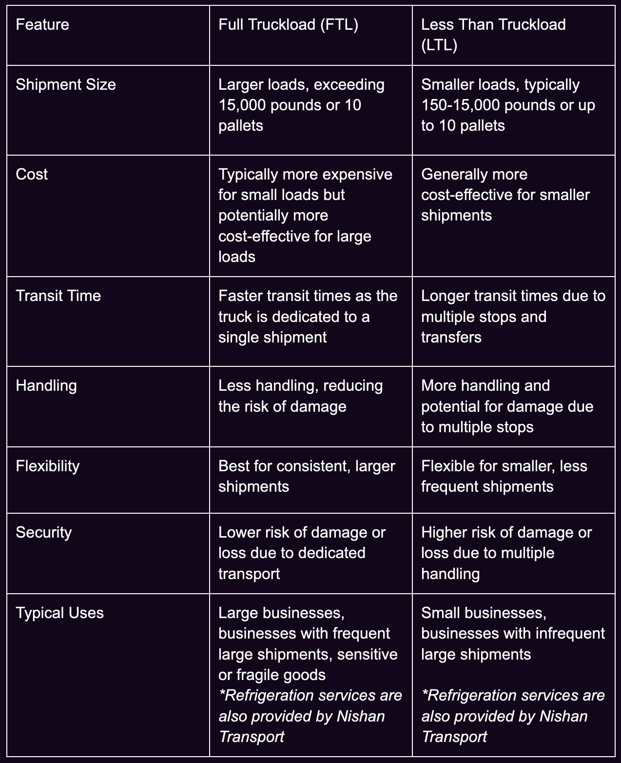 However, refrigerated freight transportation service is available for both FTL and LTL deliveries through Nishan Transport. Thus, ensuring uninterrupted cooled air supply regardless of your other needs. The chart below offers a summary of the above information to help assess which option may be more applicable to your needs.